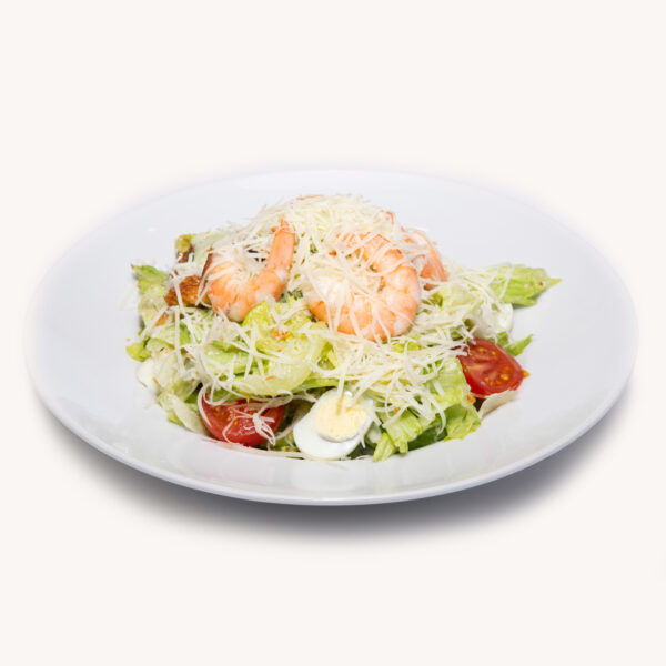 яйце перепелине, лист салата, помидор, грінки, сир, креветка, соус цезар