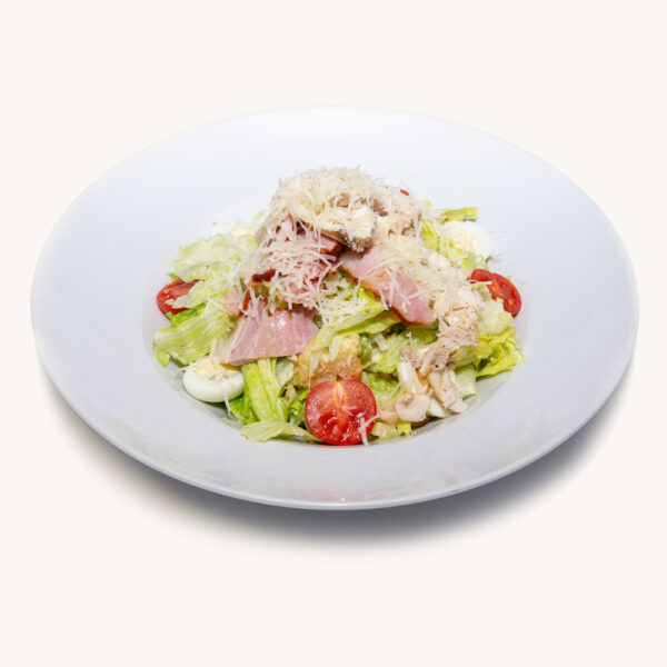 яйце перепелине, бекон, помідор, листя салату, куряче філе, грінки, сир