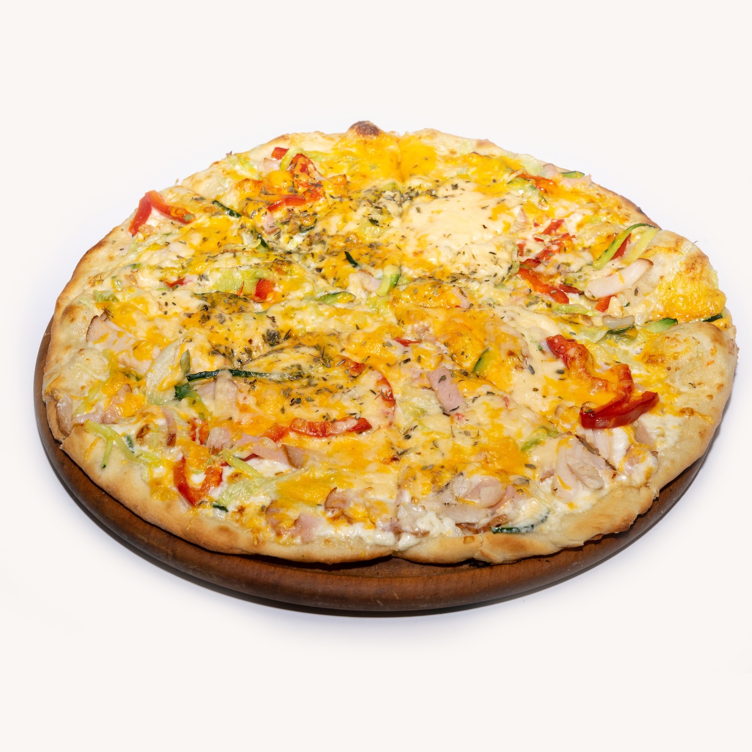 тісто, сир тертий Моцарелла, огірок свіжий або маринований, соус медово-гірчичний, перець болгарський, салат айсберг, гриби смажені, курка, балик копчений