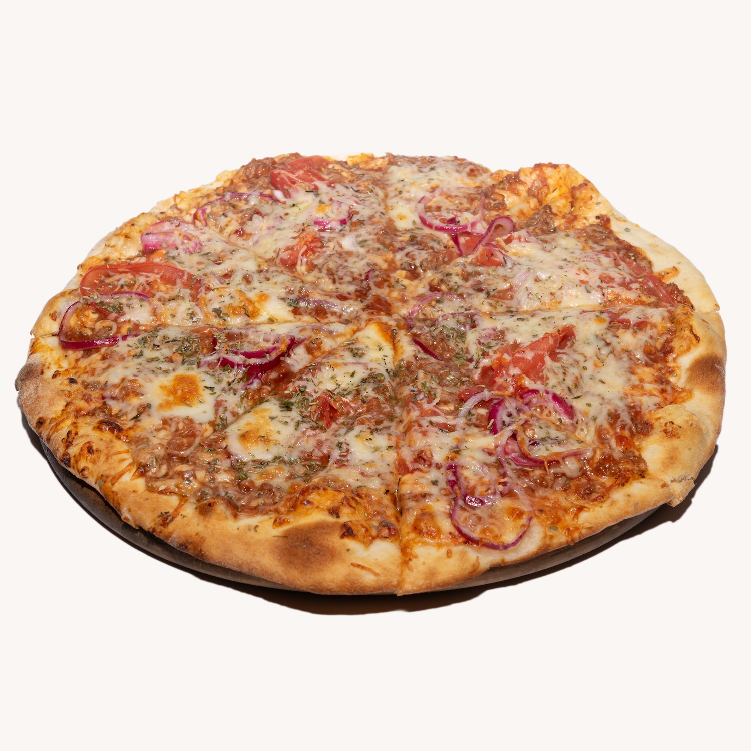 соус болоньєзе, сир тертий Моцарелла, м’ясо (фарш) яловичина, сир Пармезан, помідор свіжий, орегано