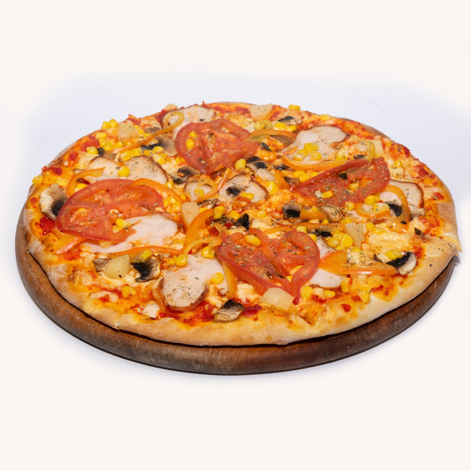 соус болгарський, сир тертий Моцарелла, філе куряче копчене, помідор свіжии, гриби печериці свіжі, ананас консерв., кукурудза консервована, болгарський перець, орегано