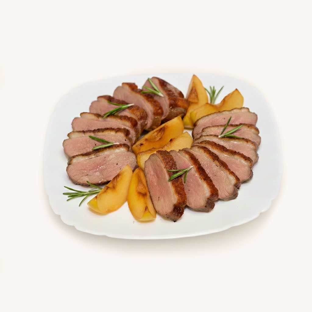запечене яблуко, філе качине, стружка миндалю, з соусом унагі