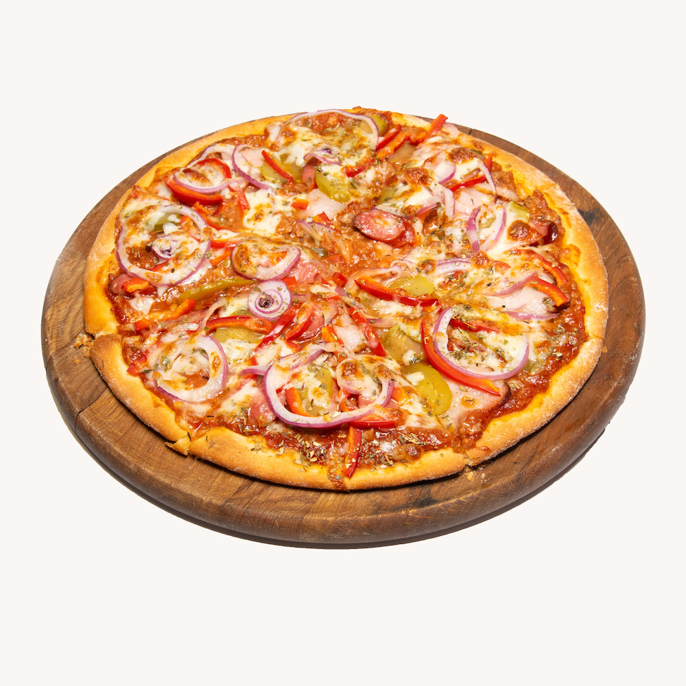 фарш, бекон, ковбаски мисливські, цибуля, сир тертий Моцарелла, марінований огірок, болгарський перець