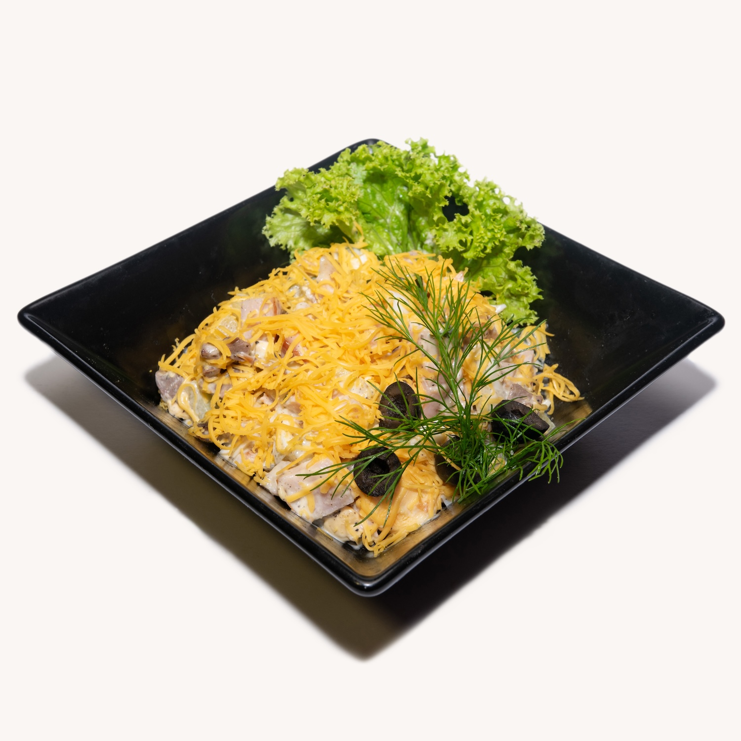 відварений язик, шинка, яйце, огірок марінований, морква, майонез