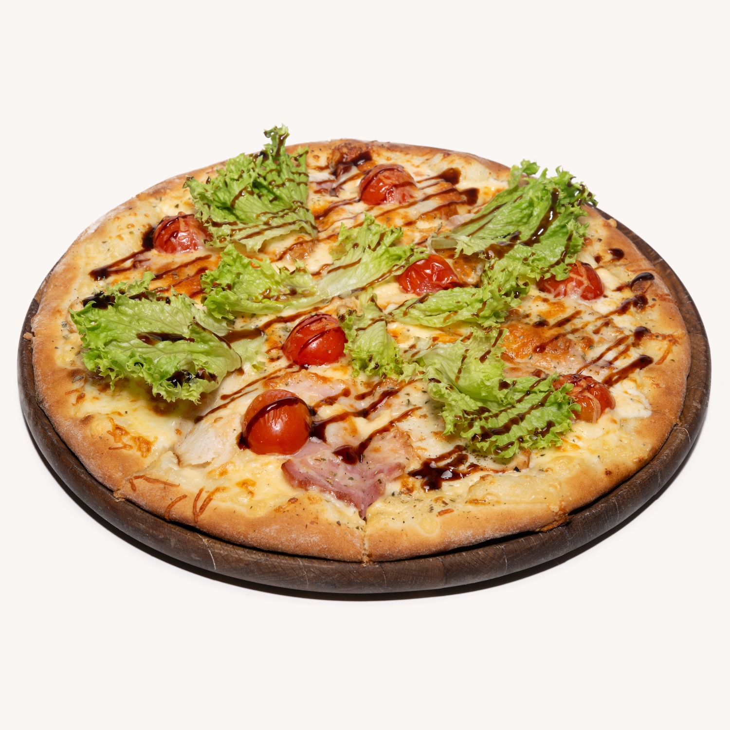 соус вершковий, сир тертий Моцарелла, філе куряче копчене, бекон, свіжий помідор, сир Пармезан, салат мікс, орегано, бальзамічна глазур
